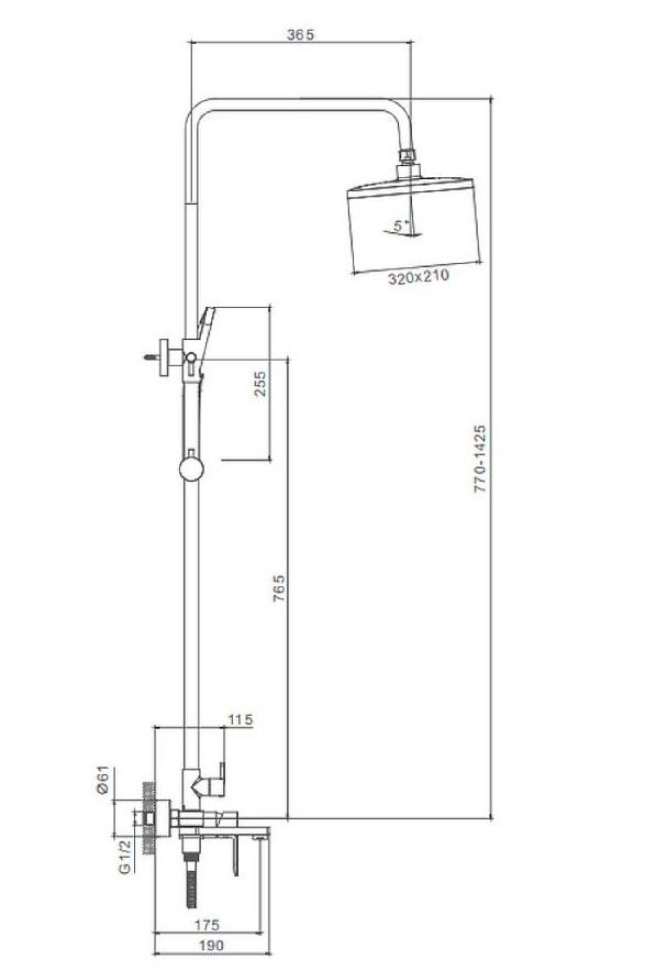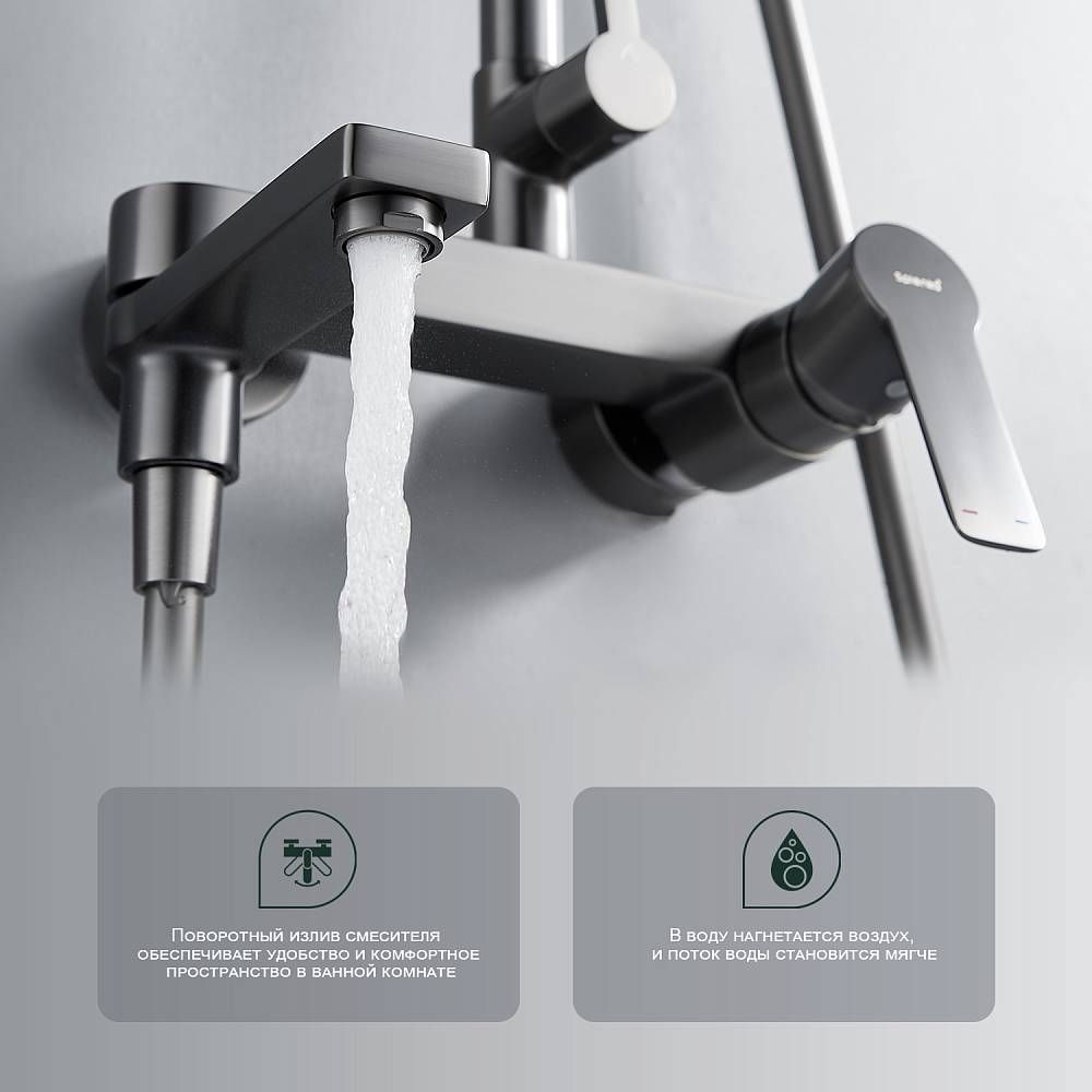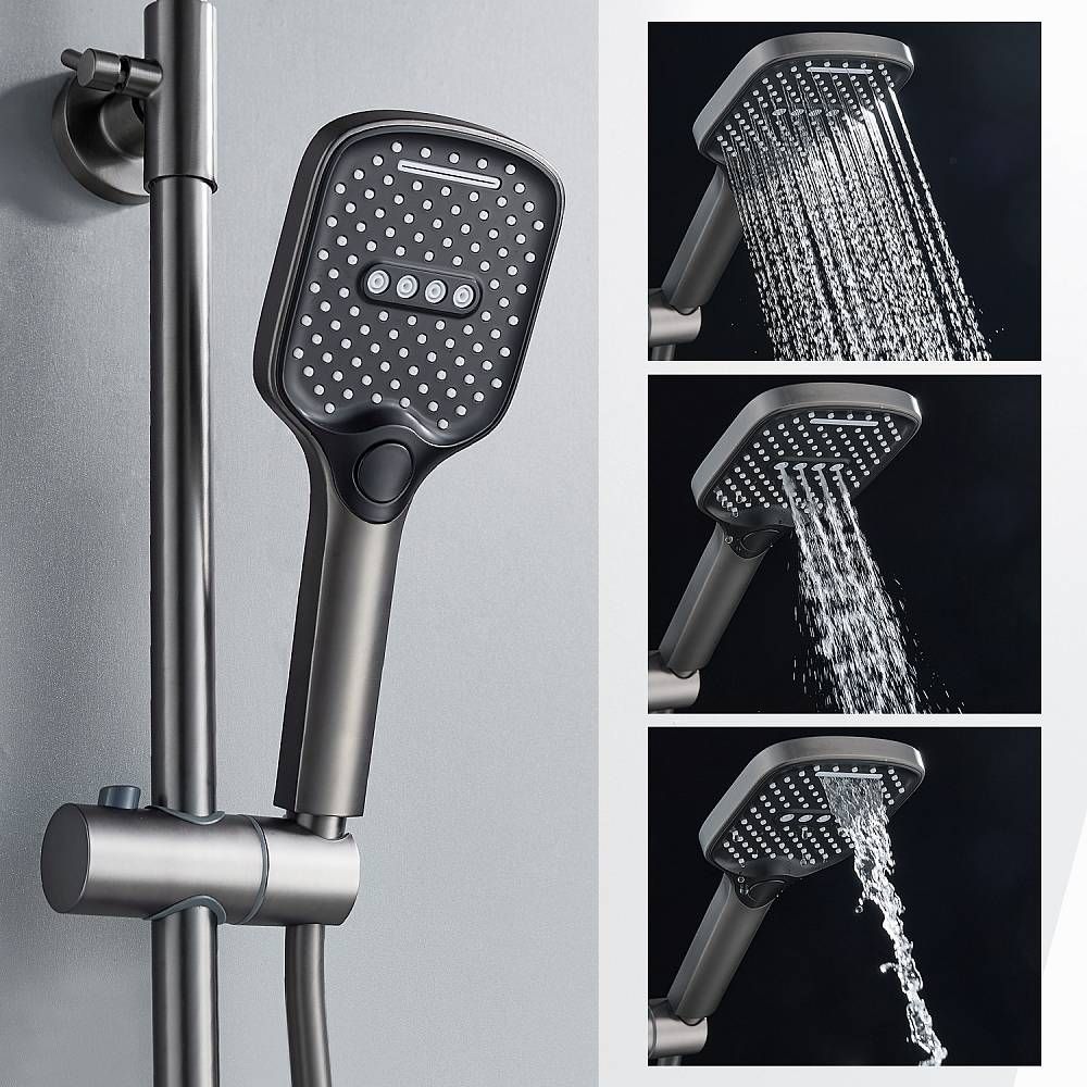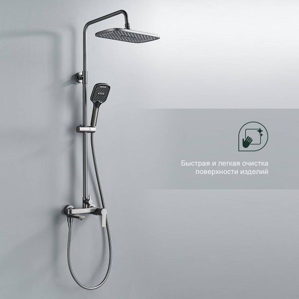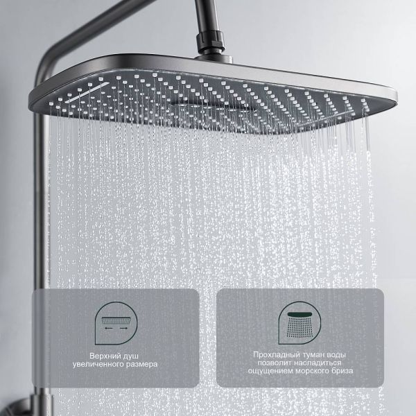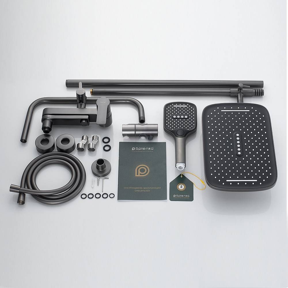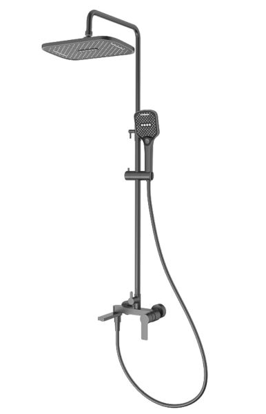Душевая система Splenka S06.24.09. Цвет: графит. Материал: латунь. Управление: однорычажное. Механизм: керамический картридж. Излив: поворотный. Аэратор. Стандарт подводки: G 1/2. Форма верхнего душа: прямоугольная. Размер верхнего душа (ШхД): 320х210 мм. Количество режимов струи ручного душа: 3. Регулируемая душевая штанга: 770-1425 мм. Монтаж: на стену. Излив - функция переключения.