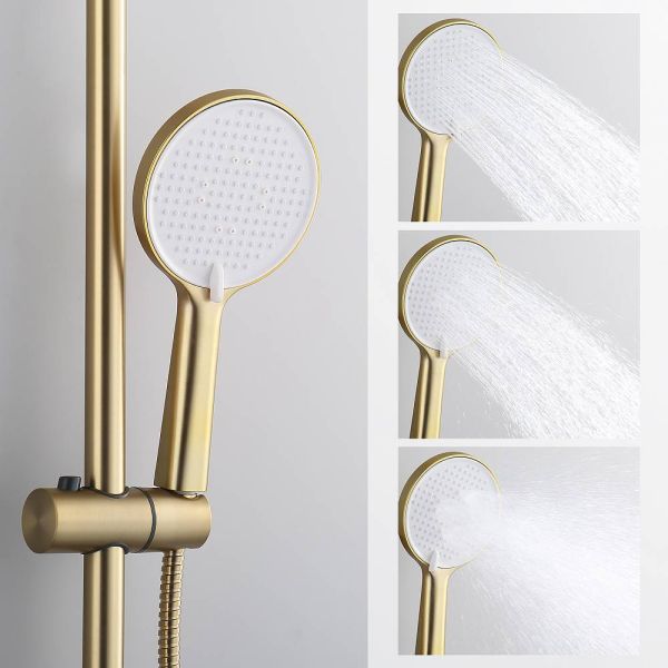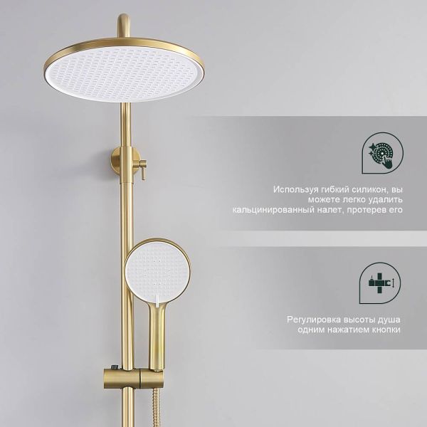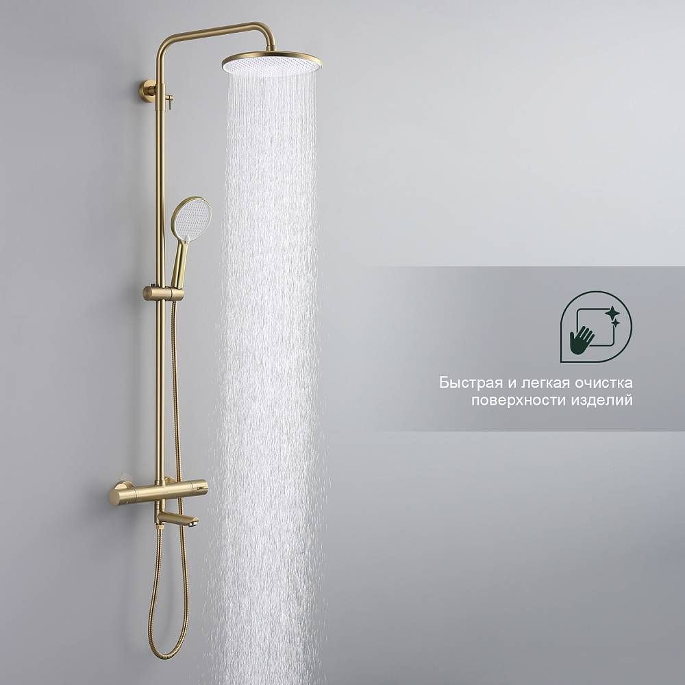 Душевая система с термостатом Splenka S223.26.03, сатин золотой. Душевая система термостатическая подходит для ванны и душа. Излив у системы поворотный. Излив - функция переключения режима. Верхний душ имеет круглую форму. Верхний душ - ∅250мм. Ручная лейка у системы 3-х режимная. Лейки изготовлены из авс-пластика.