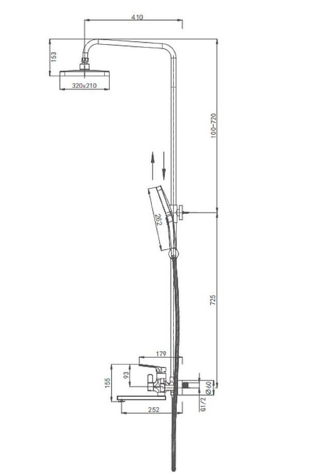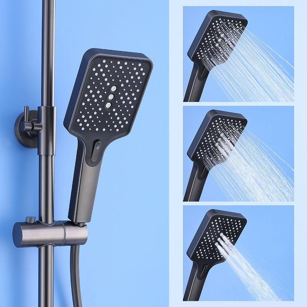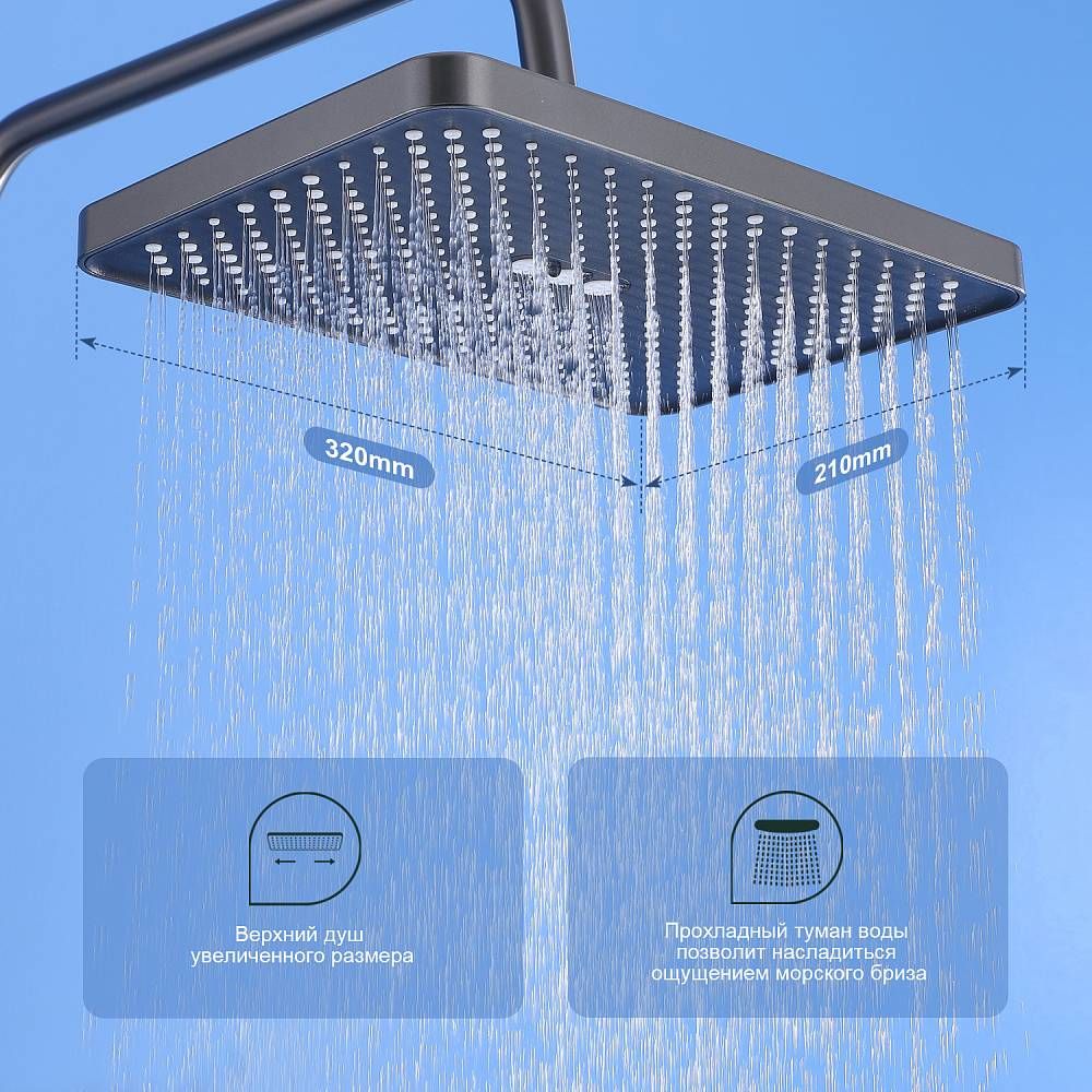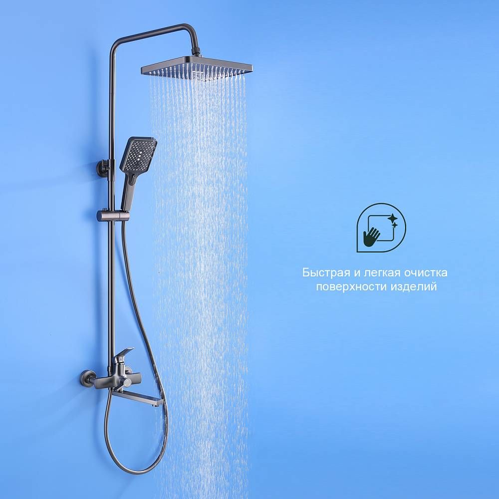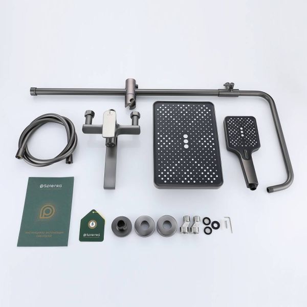 Душевая система Splenka S30.24.09, черный. Душевая система подходит для ванны и душа. Излив у системы имеет функцию переключения режима подачи воды. Верхний душ имеет прямоугольную форму размером 32 на 21 см. Ручная лейка у системы 3-х режимная. Лейки изготовлены из авс-пластика.