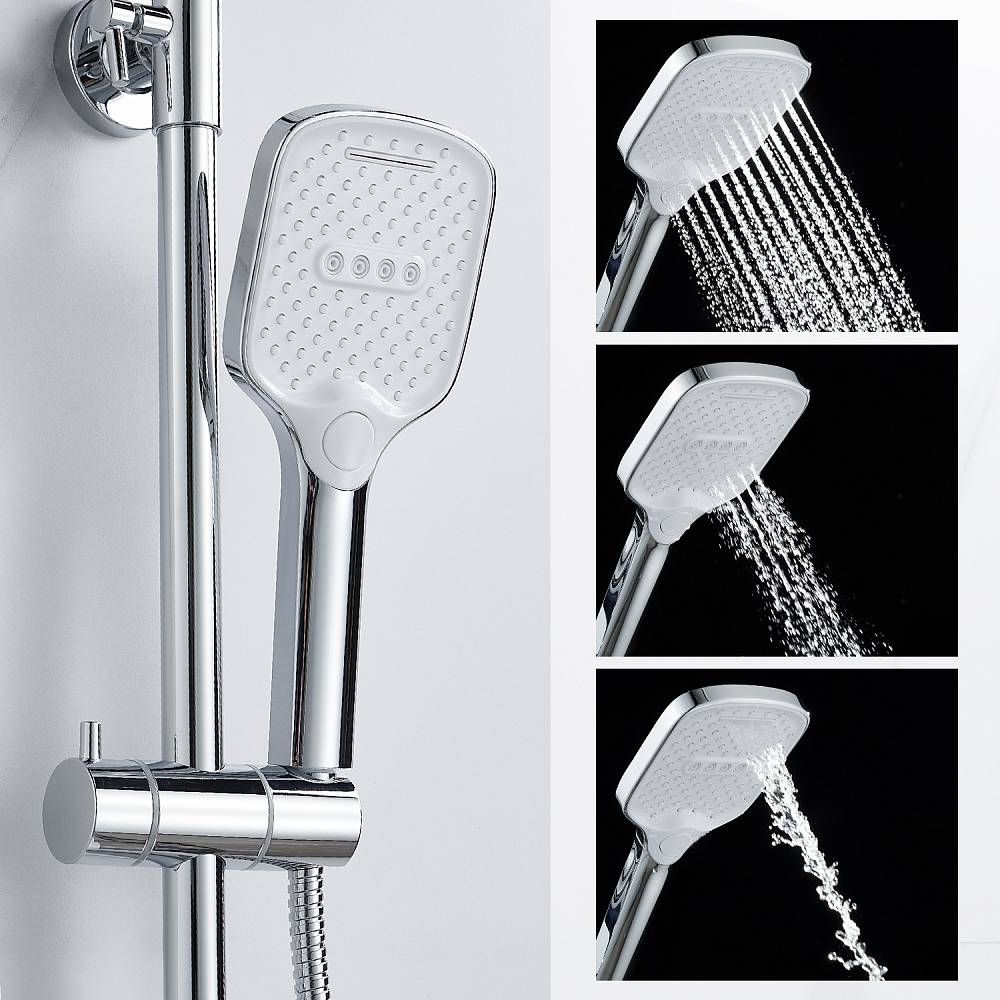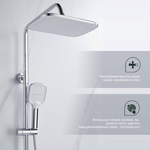 Душевая система Splenka S31.24. Цвет: хром. Материал: латунь. Управление: однорычажное. Механизм: керамический картридж. Излив: поворотный. Тип излива: каскадный. Аэратор. Стандарт подводки: G 1/2. Форма верхнего душа: прямоугольная. Размер верхнего душа (ШхД): 320х210 мм. Количество режимов струи ручного душа: 3. Переключение режимов ручного душа: кнопочное. Регулируемая душевая штанга. Регулируемый по высоте держатель ручного душа. Монтаж: на стену. Излив - функция переключения.