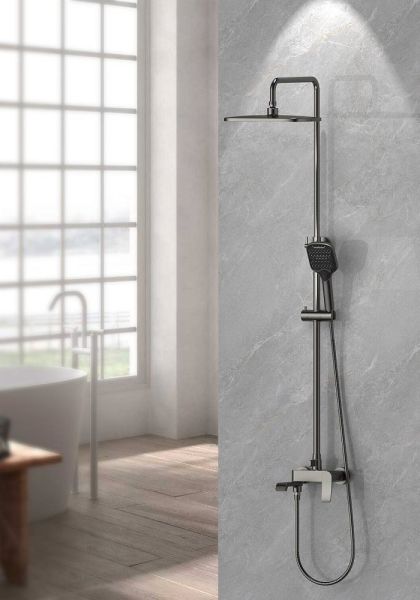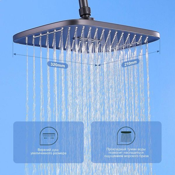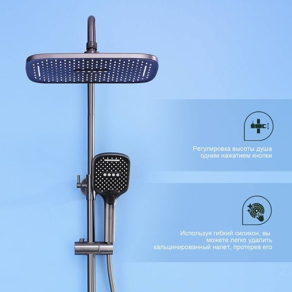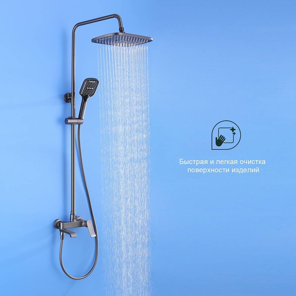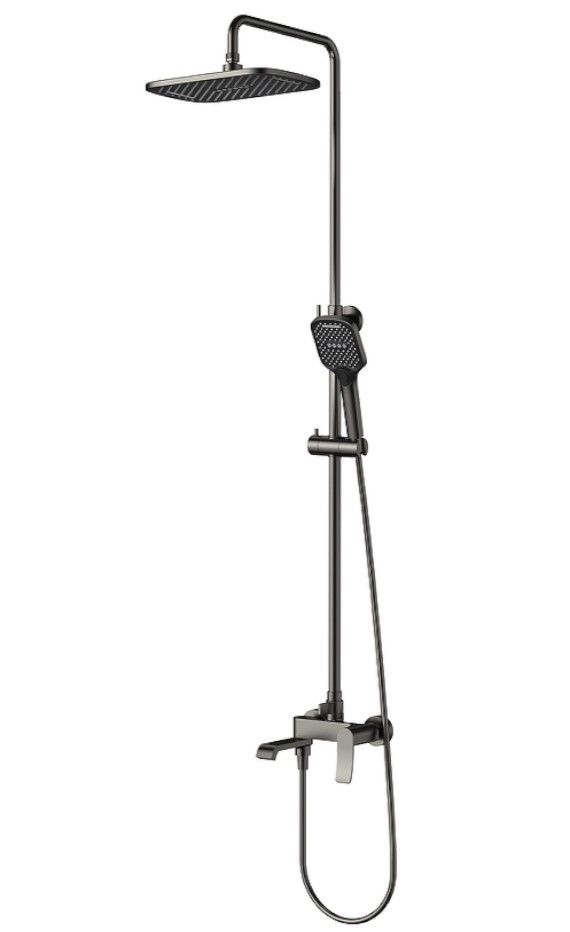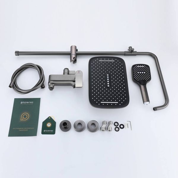 Душевая система Splenka S31.24.09. Цвет: графит. Материал: латунь. Управление: однорычажное. Механизм: керамический картридж. Излив: поворотный. Тип излива: каскадный. Аэратор. Стандарт подводки: G 1/2. Форма верхнего душа: прямоугольная. Размер верхнего душа (ШхД): 320х210 мм. Количество режимов струи ручного душа: 3. Переключение режимов ручного душа: кнопочное. Регулируемая душевая штанга. Регулируемый по высоте держатель ручного душа. Монтаж: на стену. Излив - функция переключения.