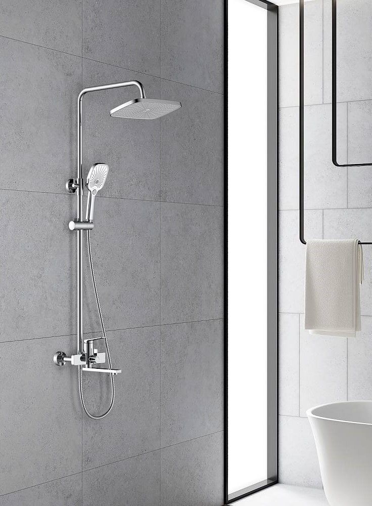 Душевая система Splenka S40.24. Цвет: хром. Материал: латунь. Управление: однорычажное. Механизм: керамический картридж. Излив: поворотный. Аэратор. Стандарт подводки: G 1/2. Форма верхнего душа: прямоугольная. Размер верхнего душа (ШхД): 300х190 мм. Количество режимов струи ручного душа: 3. Переключение режимов ручного душа: кнопочное. Регулируемая по высоте душевая штанга: 950-1350 мм. Регулируемый по высоте держатель ручного душа. Монтаж: на стену.