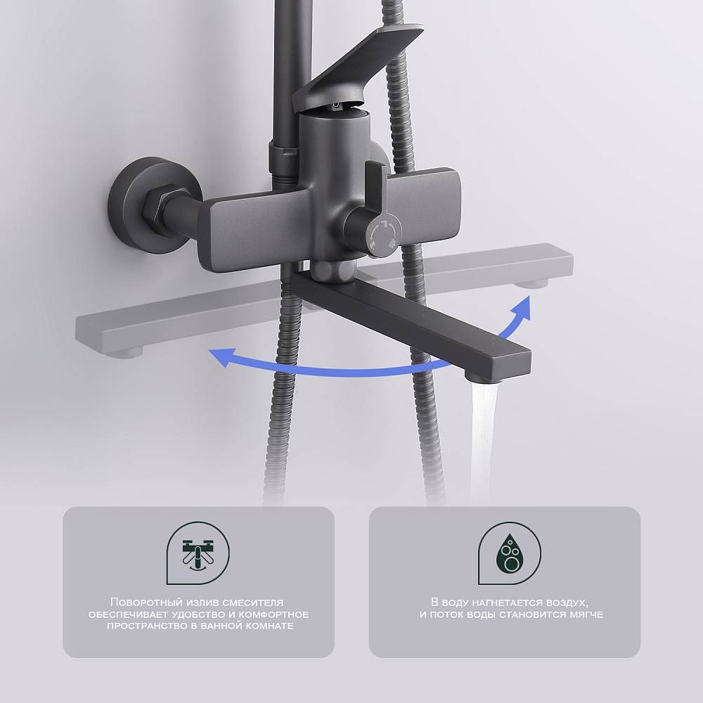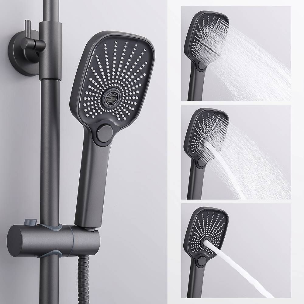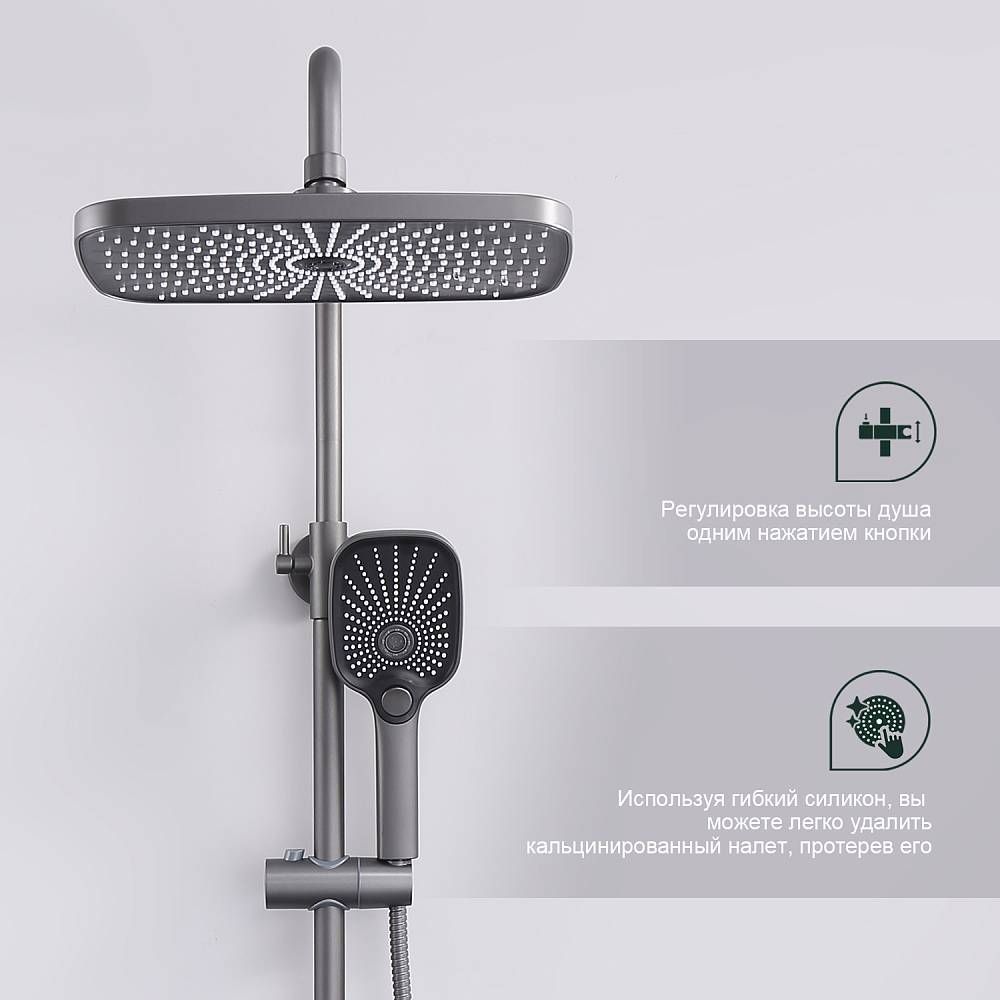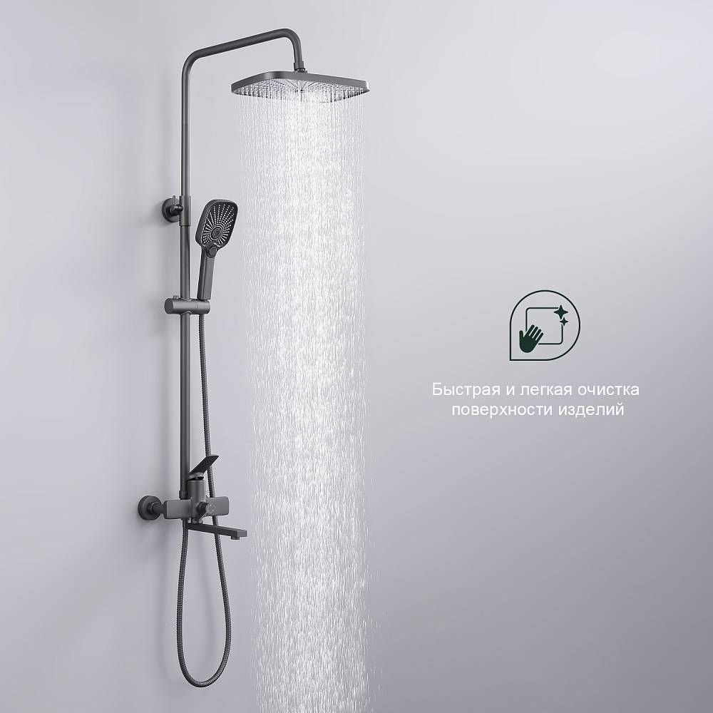 Душевая система Splenka S40.24.07. Цвет: серый. Материал: латунь. Управление: однорычажное. Механизм: керамический картридж. Излив: поворотный. Аэратор. Стандарт подводки: G 1/2. Форма верхнего душа: прямоугольная. Размер верхнего душа (ШхД): 300х190 мм. Количество режимов струи ручного душа: 3. Переключение режимов ручного душа: кнопочное. Регулируемая по высоте душевая штанга: 950-1350 мм. Регулируемый по высоте держатель ручного душа. Монтаж: на стену.