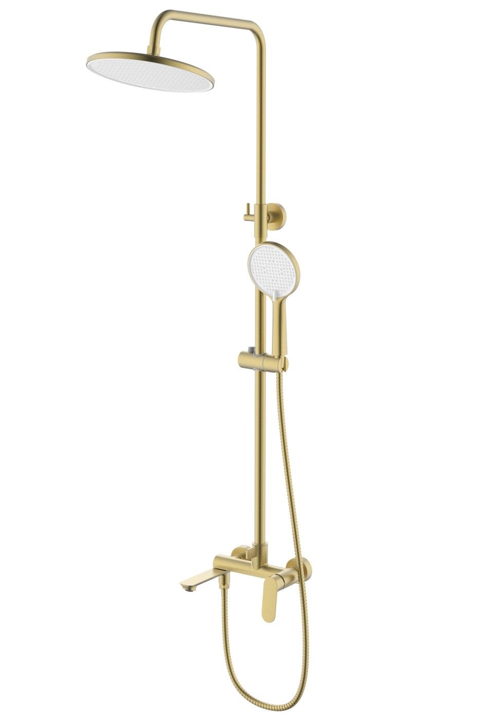 Душевая система Splenka S41.24.03. Цвет: золотой сатин. Материал: латунь. Управление: однорычажное. Механизм: керамический картридж. Излив: поворотный. Аэратор. Стандарт подводки: G 1/2. Форма верхнего душа: круглая. Диаметр верхнего душа: 250 мм. Количество режимов струи ручного душа: 3. Переключение режимов ручного душа: флажковое. Регулируемая по высоте душевая штанга: 950-1350 мм. Регулируемый по высоте держатель ручного душа. Монтаж: на стену. Излив - функция переключения.