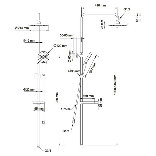 Семейный душ с верхним подключением и со смесителем для душа, верхний душ: диаметр 214 мм,лейка: диаметр 120 мм, 3 режима.Шланг PVC: 1,75 м.Цвет: черный.