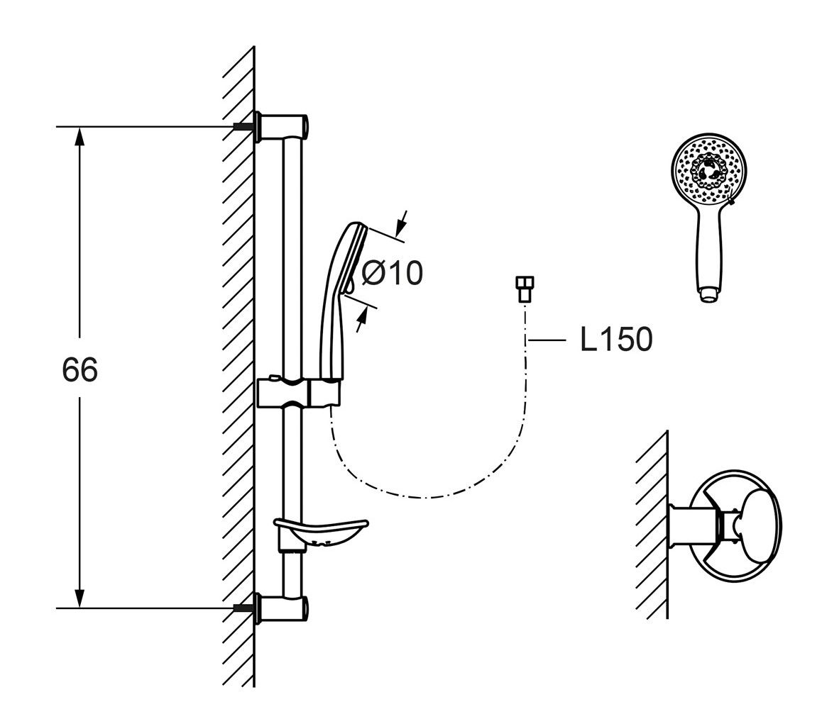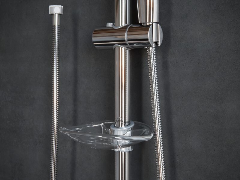 Комплектация - ручной душ, держатель лейки поворотный, мыльница, душевой шланг, набор для монтажа.