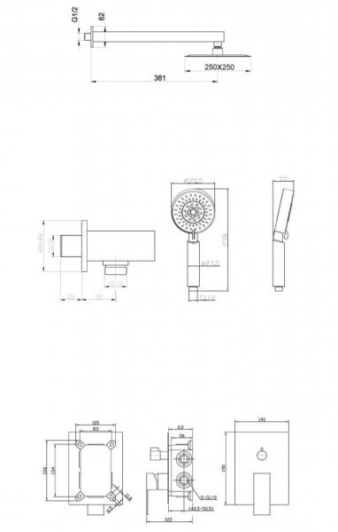 Оснащение: встраиваемый смеситель с переключателем на два выхода, верхний душ диаметр 25 см с изливом, ручной душ со шлангом, штуцером и держателем