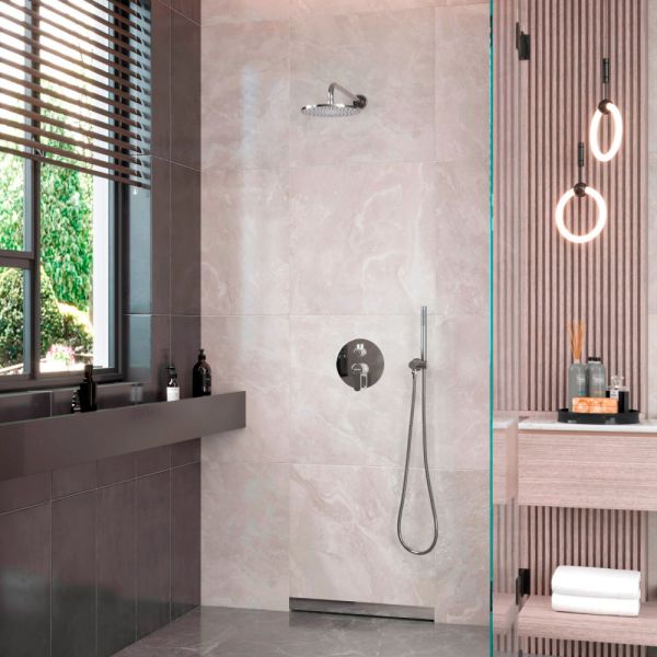 Латунный корпус (квадрат/круr)Душевой шланг 150 см из нержавеющей стали (внутри epdm) Рычажное управлениеСистема против известковых отложенийЭкономия расхода водыКерамический картридж 28 л/минДержатель верхнего душа из нержавеющей сталиДержатель ручного душа из латуниВерхний душ нержавеющая стальСтандарт подводки ½”Вылет верхнего душа: 40 смКол-во режимов ручного душа: 1