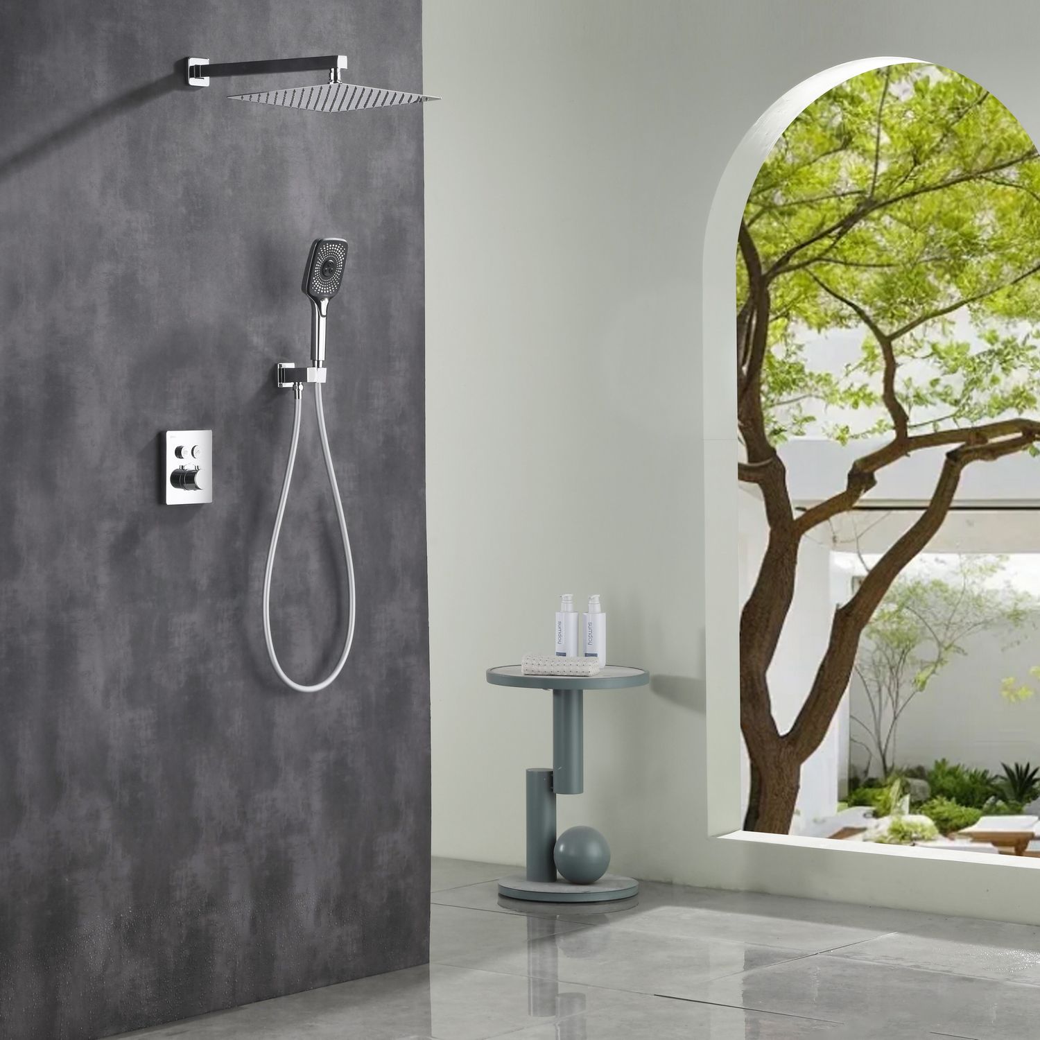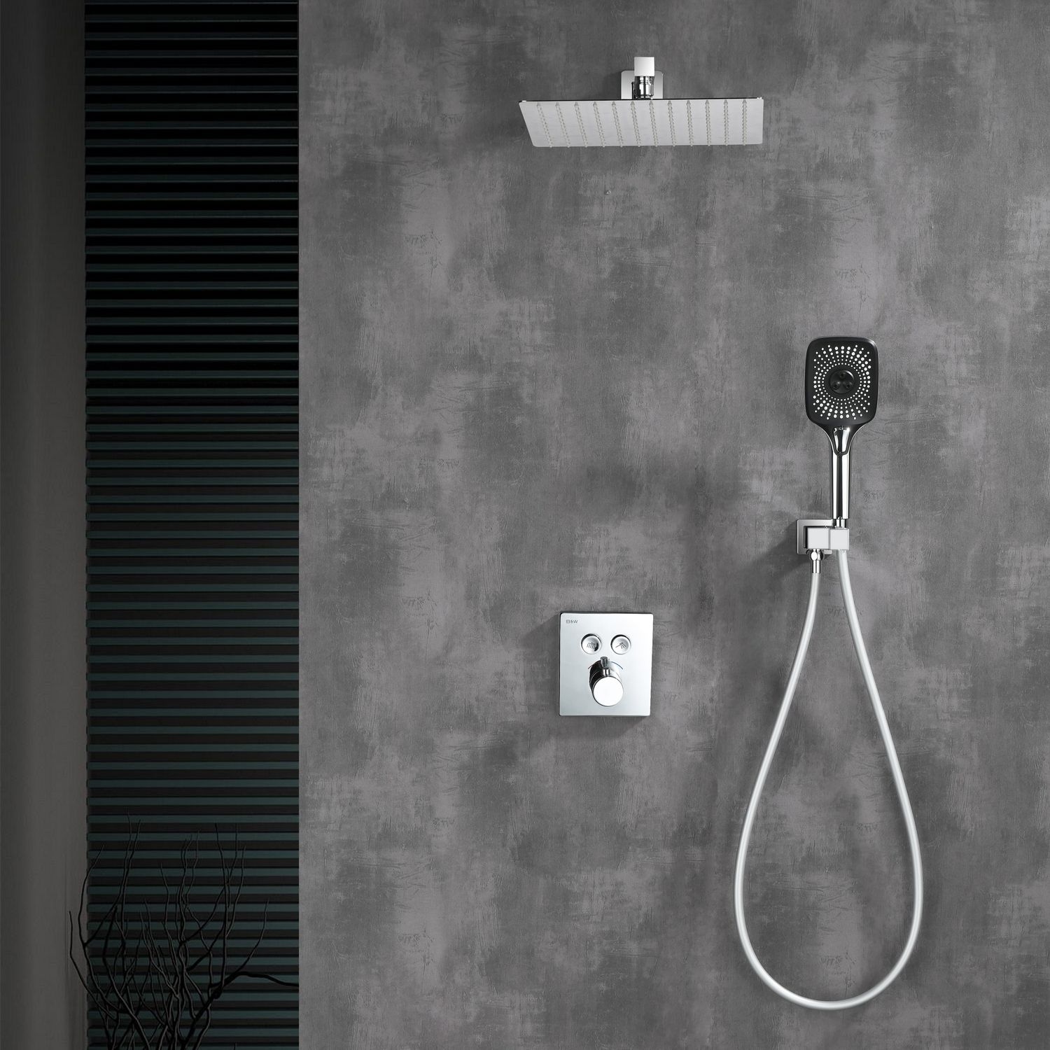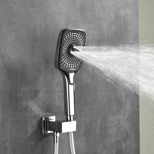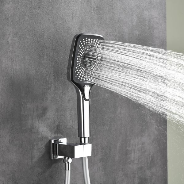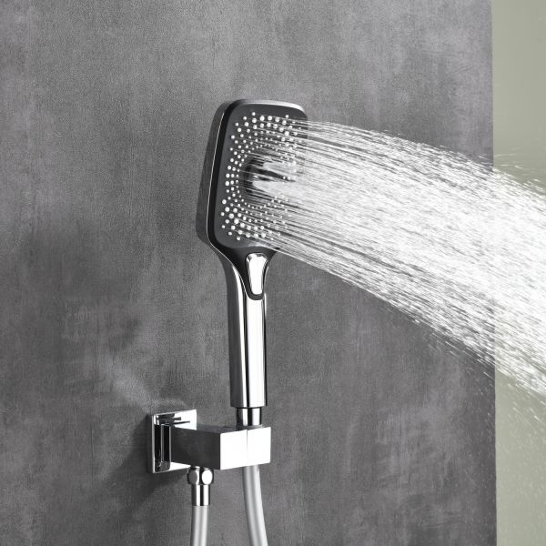 Готовое решение для душевой зоны скрытого монтажа датского производителя Black&White в цвете глянцевый хром. За управление давлением и температурой воды отвечает теромостатический смеситель постоянного потока , а для  выбора режимов работы установлены две кнопки цилиндрической формы, расположенные в квадратном корпусе смесителя.Из потребителей доступен ручной душ с режимами , а также  квадратная верхняя лейка на прямоугольном кронштейне. В дизайне изделия пересекаются квадратные и цилиндричсекие формы, которые гармонируют между собой создавая минималистичный облик, подходящий для большинства современных интерьеров