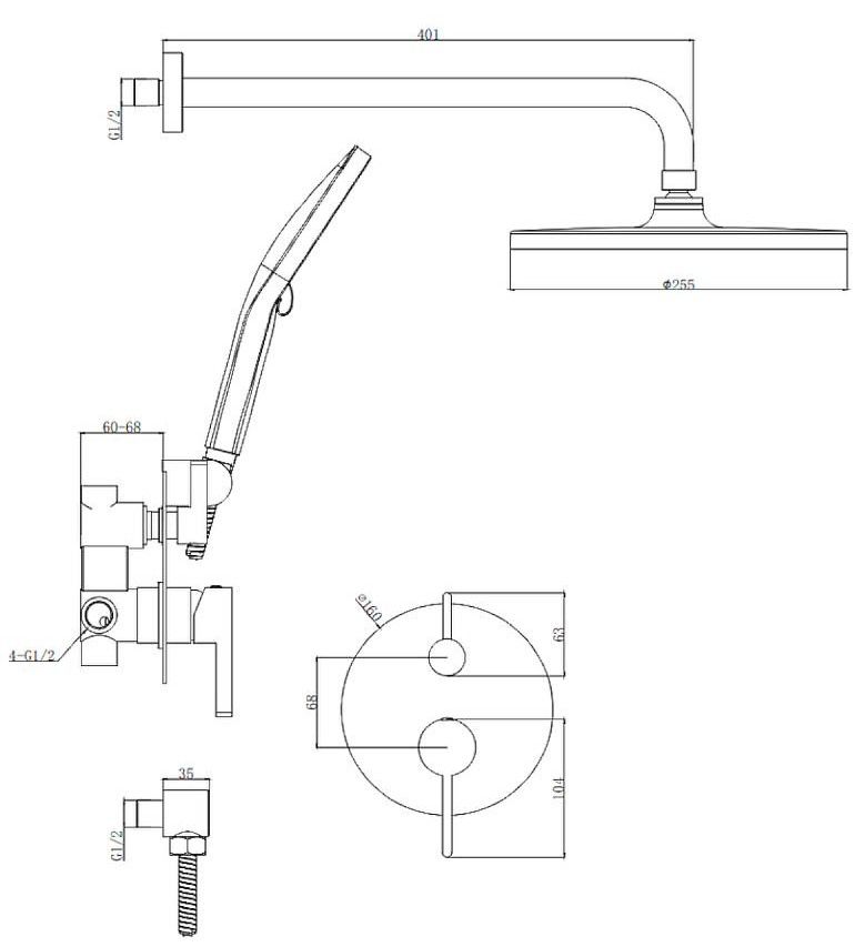 Душевая система встраиваемая Splenka S222.27.06, черный. Материал: нержавеющая сталь. Управление: однорычажное. Механизм: керамический картридж. Стандарт подводки: G 1/2. Форма верхнего душа: круглая. Диаметр верхнего душа: 255 мм. Длина кронштейна: 401 мм. Количество режимов струи ручного душа: 3. Монтаж: встраиваемый. Излив - функция переключения.