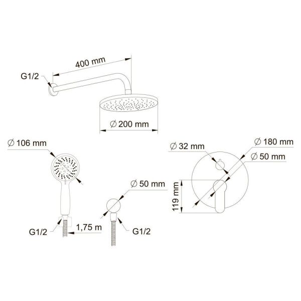 - верхний душ (душевая головка) с регулировкой наклона, настенный монтаж;