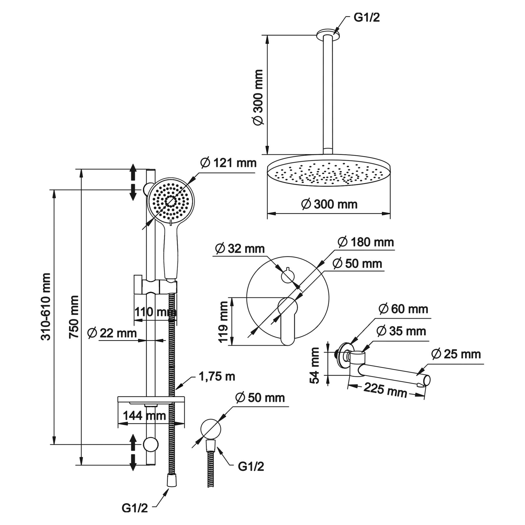 - верхний душ (душевая головка) с регулировкой наклона, потолочный монтаж;