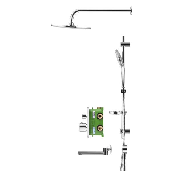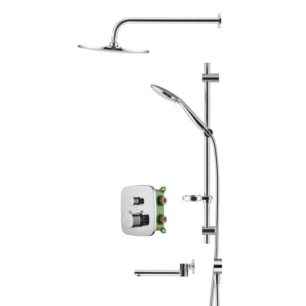 Душевой комплект со встраиваемым термостатическим смесителем на 3 выхода (в монтажном боксе), верхним душем ø300 мм, лейкой ø121 мм (3 режима) и поворотным изливом