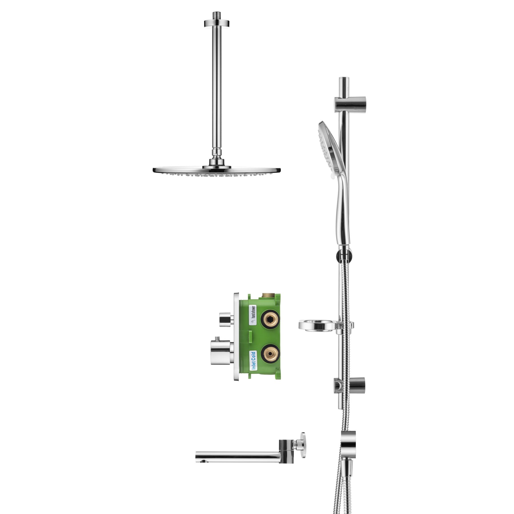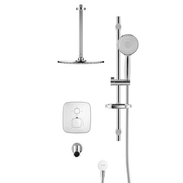 Душевой комплект со встраиваемым термостатическим смесителем на 3 выхода (в монтажном боксе), верхним душем ø300 мм, лейкой ø121 мм (3 режима) и поворотным изливом