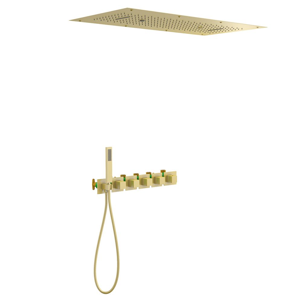 Цвет "матовое золото" никогда не выйдет из моды, во все времена драгоценный металл был признаком богатства.Встраиваемая душевая система с термостатом Timo Petruma 5329 относится к премиальному сегменту, предназначена для монтажа в полой или твердой стене. Термостатический картридж поддерживает стабильную температуру воды, обеспечивая максимально комфортные условия для принятия водных процедур. Встроенный потолочный душ большого размера создает имитацию проливного дождя, вода обливает человека целиком. Регулируя напор воды можно получить массажное воздействие, что очень полезно для здоровья. Основные преимущества встроенной системы: элегантный внешний вид, все коммуникации и крепления спрятаны в стену и потолок, снаружи видны только декоративные элементы. Установить встроенную систему можно в любом месте. Сложностей монтажа не возникает при установке элементов душевой системы опытным сантехником. Внимательно изучите инструкцию по монтажу и эксплуатации.