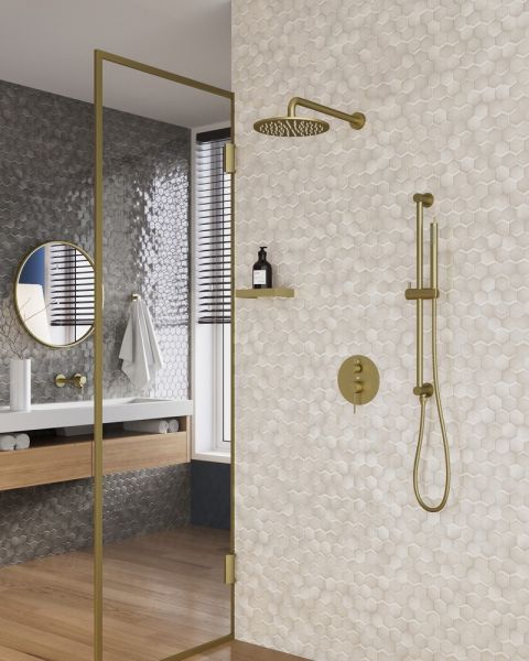 Цвет "матовое золото" никогда не выйдет из моды, во все времена драгоценный металл был признаком богатства.Встраиваемая душевая система Saona 2309, предназначена для монтажа в полой или твердой стене. Основные преимущества встроенной системы: коммуникации, крепления и механизмы спрятаны в стену и видны только декоративные элементы. Установить встроенную систему можно в любом месте. Cтильная стойка из латуни позволяет установить ручную лейку-карандаш на необходимую высоту. Использовать такой смеситель очень удобно, регулировка температуры и напора воды осуществляется одним рычагом. Регулируя напор воды в режиме "тропический душ", можно получить массажное воздействие различной интенсивности. Переключение режимов подачи воды (тропический душ, ручная лейка) осуществляется поворотом керамического дивертора. Сложностей монтажа не возникает при установке элементов душевой системы опытным сантехником. Внимательно изучите инструкцию по монтажу и эксплуатации.