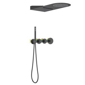 Черная сантехника становится все более популярной для ванных комнат из-за спообности расставлять акценты.Душевая система с термостатом Timo Saona 2350 относится к премиальному сегменту, предназначена для монтажа в полой или твердой стене. Термостатический картридж поддерживает стабильную температуру воды, обеспечивая максимально комфортные условия для принятия водных процедур. Настенный душ с двумя режимами позволяет принимать водные процедуры в зависимости от настроения. Регулируя напор воды можно получить массажное воздействие различной интенсивности. Используя режим "каскад"- получают седативное (успокаивающее) воздействие на затылочную часть головы или шейный отдел. Основные преимущества встроенной системы: элегантный внешний вид, все коммуникации и крепления спрятаны в стену, снаружи видны только декоративные элементы. Установить встроенную систему можно в любом месте. Использовать такой смеситель очень удобно, регулировка температуры воды осуществляется ручкой термостата (расположена справа). Переключение режимов "каскад", "тропический душ", "ручной душ" и увеличение напора осуществляется поворотом ручек диверторов расположенных слева от термостата. В положении ручек диверторов в положение 12:00 (смеситель выключен). Смеситель может работать в нескольких режимах одновременно"каскад"+"ручной душ", "тропический душ"+"ручной душ". Сложностей монтажа не возникает при установке элементов душевой системы опытным сантехником. Внимательно изучите инструкцию по монтажу и эксплуатации. Черная сантехника требует бережного ухода.