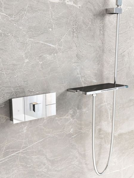 Комплектация: полка с изливом и держателем ручного душа, ручной душ, смеситель со встраиваемой частью.