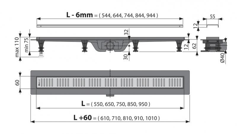 Душевой лоток AlcaPlast Simple с решеткой и опорами APZ10-550M