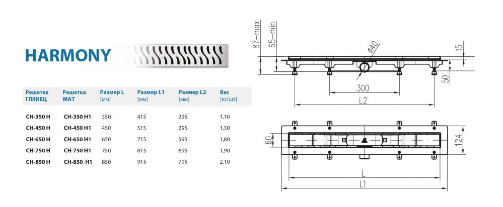 Водоотводящие желоба это атрибут для современного интерьера ванных комнат, сауны и зоны отдыха. Их преимуществом является простота установки, обслуживания и эксплуатация базбарьерной зоны. Монтаж можно производить как на открытых участках боксов и кабин, так и в близи стен. Нижняя часть изготовлена из ПП и ПС, решётка изготовлена из нержавеющей стали DIN 1.4301 K3 с возможной нагрузкой до 300 кг. Минимальная высота установки составляет 65 мм, желоб с регулировкой высоты. Комплект состоит: инструкция по установке, водоотводящий желоб, решётка, гидроизоляционный воротник по длине желоба, двойной комбинированный сифон, крепежный комплект (шурупы, дубели, рег. ножки).Характристики: * Низкая высота 65 мм