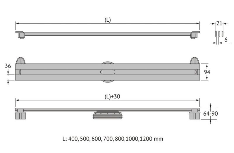 Решетка и декоративные заглушки, нержавеющая сталь AISI 304Комплект регулировки решетки по высоте от 8 до 30ммСетка для волос, пластикКомплект гидроизоляцииЖелоб водосток, нержавеющая сталь AISI 304Монтажная заглушка, пенопластРегулируемые по высоте ножки, пластикСамопромывной S-образный сифон PPВертикальный выпуск 48 л/мин , пропускная способность 42л/мин, монтаж 360°Монтажный ключ, пластик