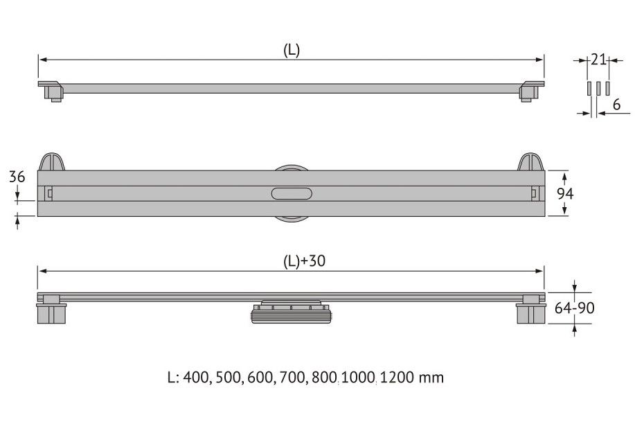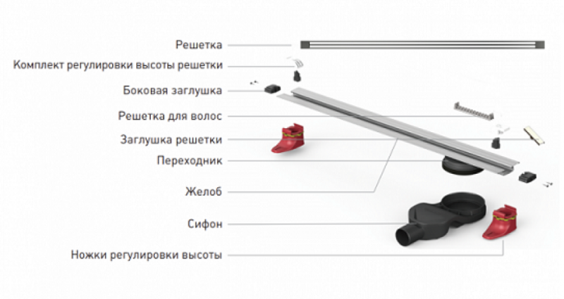 Решетка и декоративные заглушки, нержавеющая сталь AISI 304Комплект регулировки решетки по высоте от 8 до 30ммСетка для волос, пластикКомплект гидроизоляцииЖелоб водосток, нержавеющая сталь AISI 304Монтажная заглушка, пенопластРегулируемые по высоте ножки, пластикСамопромывной S-образный сифон PPГоризонтальный выпуск D50 H60, пропускная способность 42л/мин, монтаж 360°Монтажный ключ, пластик