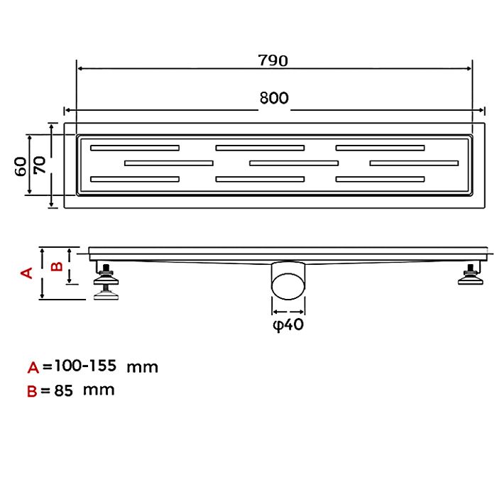 Линейный трап Gappo G88007-1, длина 80 см, цвет сатин, изготовлен трап из нержавеющей стали. Минимальная монтажная высота 85 мм, боковой выпуск 40 мм, в комплекте переходник на 50 мм. Защита от запаха: комбинированный гидрозатвор, защита от проникновения запаха и жидкости из канализации.