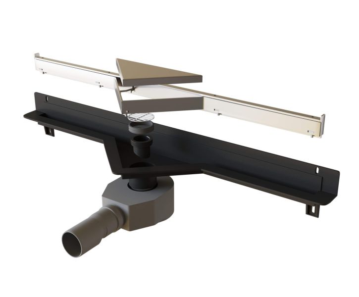 • Визуально скрытый дренаж с треугольной крышкой из нержавеющей стали, позволяющей вложить плитку и воплотить дизайн-концепцию в стиле "минимализм";