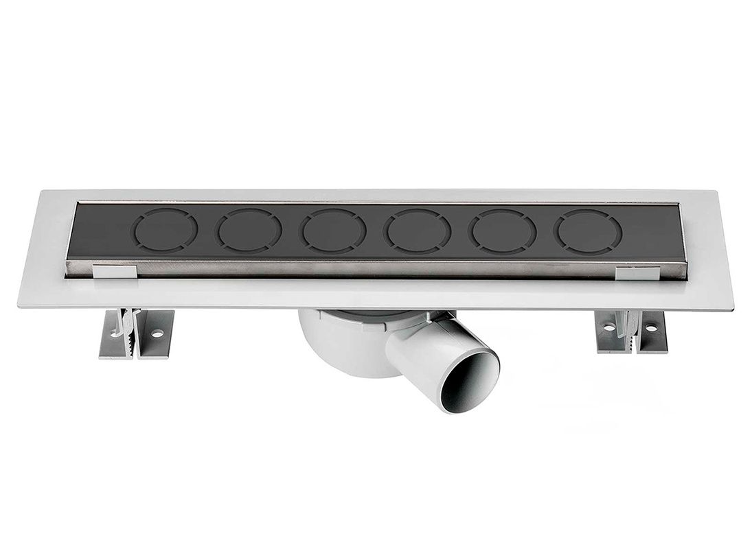 Комплектация: поворотный сифон 360 градусов из ABS-пластика, водонепроницаемые уплотнительные кольца, дренажный канал из ABS-пластика, противозапаховый затвор, водонепроницаемая мембрана, рамка и решетка из нержавеющей стали 2 мм, комплект регулируемых по высоте опор, пластиковый сервисный ключ, регулировочный винт из нержавеющей стали, регулировка соединения.