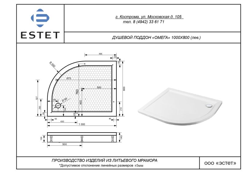 Для малогабаритных санузлов мы разработали угловые душевые поддоны. Поддон Омега имеет ассиметричную форму и невысокие бортики. Литьевой мрамор обладает изоляционными свойствами, шум воды не будет мешать вашему повседневному использованию.