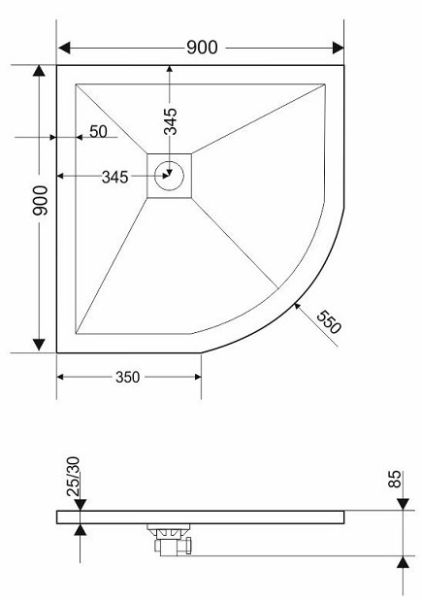 • Размеры поддона: четверть круга 90 x 90 толщина 2,5 см