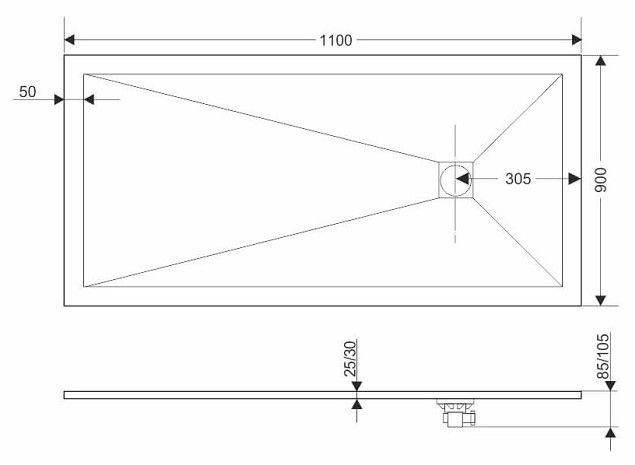 • Размеры поддона: прямоугольный 110 x 90 толщина 2,5 см