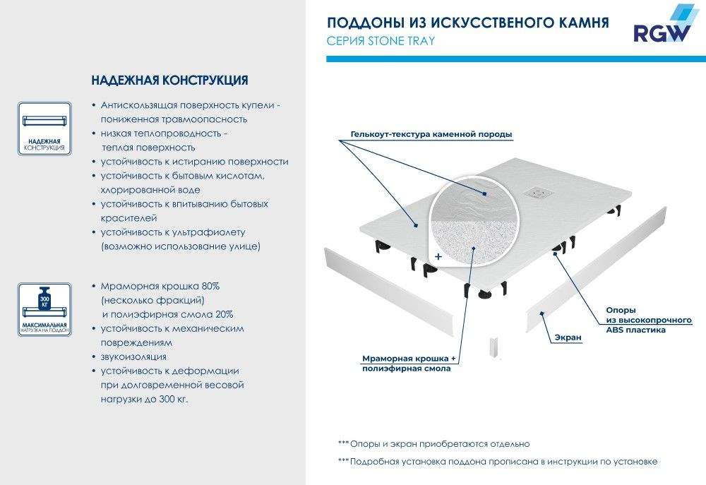 Душевые поддоны RGW ST с фактурой под сланцевый камень.Меняем представление о текстуре «искусственный камень»!В серии душевых поддонов Stone Tray появилась новинка популярной квадратной формы в роскошном белом цвете и трех форматах. При необходимости мы можем выполнить обрезку изделия по индивидуальному размеру.Визуальные акценты и форма поддона - новые, а качество прежнее: рельефная антискользящая поверхность в сочетании с низкой теплопроводностью материала создает ощущение нагретого солнцем камня под вашими ступнями и выводит обычный прием душа на новый уровень комфорта.Высокотехнологичный материал - 80% мраморной крошки плюс полиэфирные смолы - обеспечивает беспрецедентную устойчивость к механическим, химическим и другим видам повреждений, а также выдерживает долговременную весовую нагрузку до 300 кг.Добавьте сюда низкий уровень шума воды, когда вы принимаете душ для ещё большего удовольствия.Новый поддон — это самостоятельный аксессуар вашей душевой. Универсальный цвет, откликающийся на уровень освещения, и текстура “под камень” идеально сочетаются с интерьерами от смелых лофт и хайтек до романтичного прованса, а решетка из нержавеющей стали, защищающая слив, создаст безупречный аккомпанемент душевым системам, а таком же оттенке.Обратите внимание: фактические размеры с учетом заполнения швов могут меняться в пределах -8/+2 мм.По вашему желанию можем установить поддон на ножки: