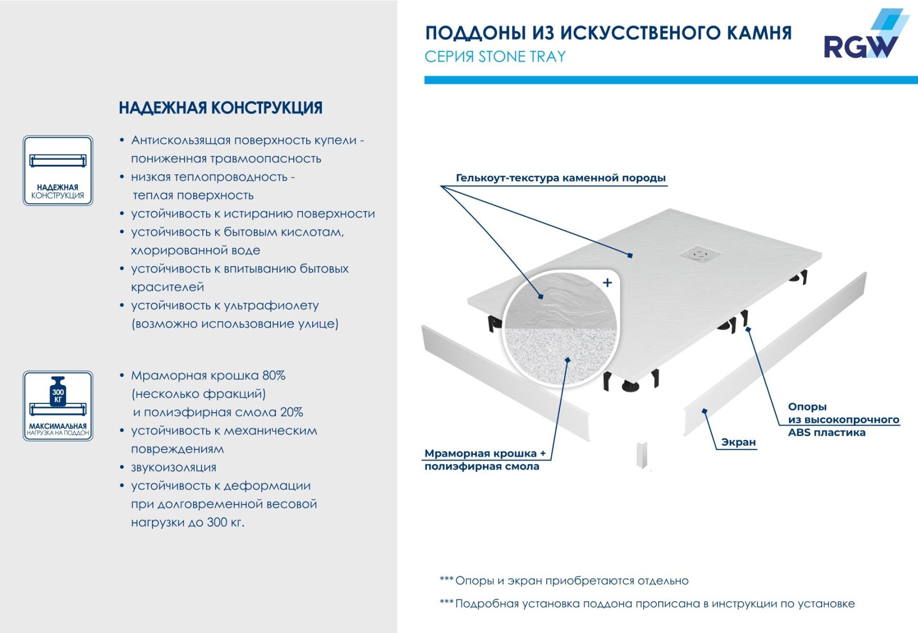 Душевые поддоны RGW ST с фактурой под сланцевый камень.Меняем представление о текстуре «искусственный камень»!В серии душевых поддонов Stone Tray появилась новинка привлекательной полукруглой формы в роскошном белом цвете и двух форматах. При необходимости мы можем выполнить обрезку изделия по индивидуальному размеру.Полукруг - идеальное решение для компактной ванной комнаты и позволит по максимум использовать полезное пространство, например, для мебели или бытовой техники.Визуальные акценты и форма поддона - новые, а качество прежнее: рельефная антискользящая поверхность в сочетании с низкой теплопроводностью материала создает ощущение нагретого солнцем камня под вашими ступнями и выводит обычный прием душа на новый уровень комфорта.Высокотехнологичный материал - 80% мраморной крошки плюс полиэфирные смолы - обеспечивает беспрецедентную устойчивость к механическим, химическим и другим видам повреждений, а также выдерживает долговременную весовую нагрузку до 300 кг.Добавьте сюда низкий уровень шума воды, когда вы принимаете душ для ещё большего удовольствия.Новый поддон — это самостоятельный аксессуар вашей душевой. Универсальный цвет, откликающийся на уровень освещения, и текстура “под камень” идеально сочетаются с интерьерами от смелых лофт и хайтек до романтичного прованса, а решетка из нержавеющей стали, защищающая слив, создаст безупречный аккомпанемент душевым системам, а таком же оттенке.Обратите внимание: фактические размеры с учетом заполнения швов могут меняться в пределах -8/+2 мм.По вашему желанию можем установить поддон на ножки: