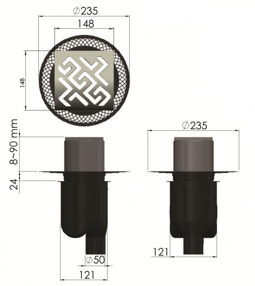Решетка толщина 3мм, нержавеющая сталь AISI 304Горловина трапа, пластикФланец трапа с переходником, РРМонтажная заглушка, PPСамопромывной S-образный сифон PPВертикальный выпуск, пропускная способность 48л/мин, монтаж 360°Монтажный ключ, пластик