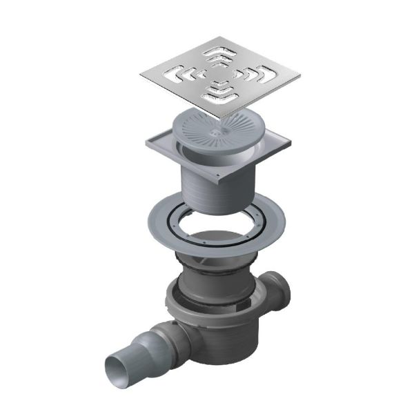 "Дизайн: металл с перфорацией Tide / Square / Drops, покрытие - хром/позолота 24К (999 проба). Базы слива: 1 - с одним выходом, 2 - с 1 выходом/1 входом, 3 - с 1 выходом/3 входами, 4 - S-образный, Vertical - вертикальный выпуск. Материалы: металлические детали - нержавеющая сталь AISI 304 SS, корпус - прочный, экологичный ABS полипропиллен. Технические характеристики: размеры решетки 100х100 мм, 150х150 мм, пропускная способность 48 л/мин, D=50 мм, поворот базы 360°, минимальная высота монтажа - 78 мм (для баз 1,2,3), 71 мм (для базы 4), 69 мм (для базы Vertical), гидрозатвор. "