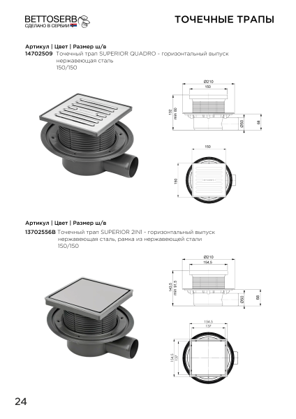 Душевой трап Трап Bettoserb 13702556B 15x15 SUPERIOR 2IN1 MULTISIPHON - горизонтальный выпуск