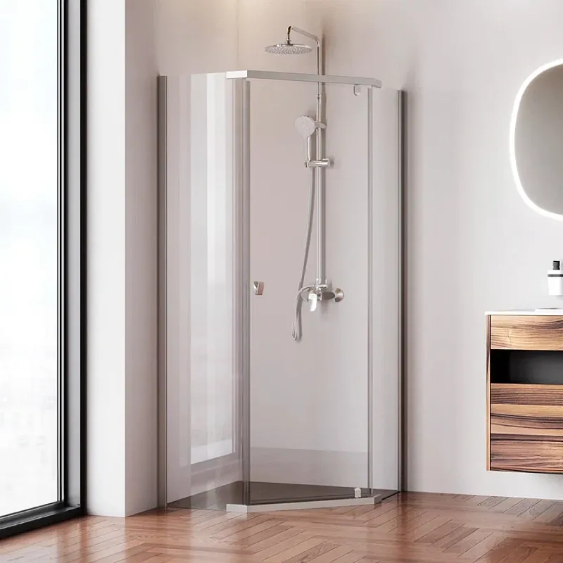 Душевой уголок AM.PM Sunny W87G-405-9090-MT 90х90 см профиль хромДушевые ограждения коллекции от бренда AM.PM из коллекции Sunny сделают ванную комнату вашим тайным местом силы и перезагрузки. Эстетика и функциональность - то, что моментально приковывает взгляды. Исключительный дизайн, к которому хочется прикоснуться. Форма модели в виде трапеции сэкономит пространство вашей ванной комнаты. А универсальная конструкция позволит выбрать при установке левую или правую версию монтажа. Высота модели достигает 195 сантиметров. Идеальный размер для комфортного пользования. Подходит даже для самых высоких. Цвет профиля - серебристый. Размер (Ш/Г/В): 880x880x1950 мм. Материал ограждения - прозрачное стекло; алюминий, сталь. Толщина стекла - 5 мм (стенка), 5 мм (дверка). Форма - пятиугольная.