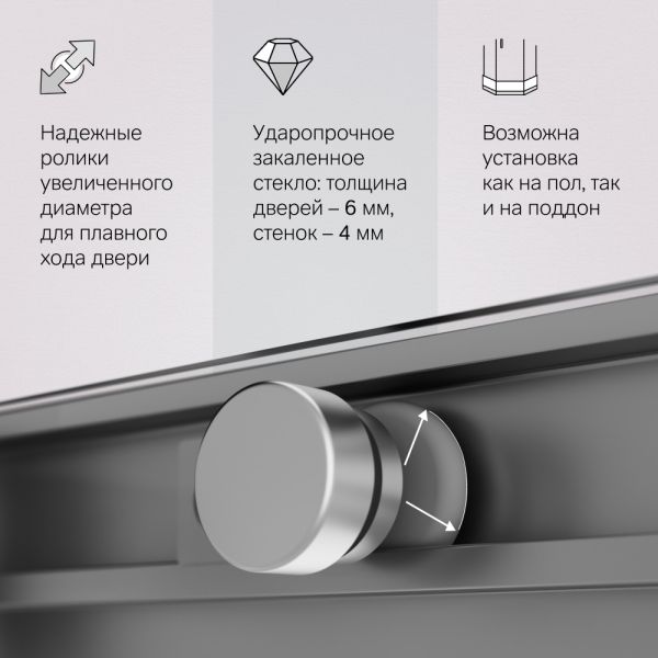 Прочная конструкция с надежными роликами увеличенного диаметра для плавного хода двери и закаленным стеклом. Толщина дверей – 6 мм., стенок – 4 мм. Беспрецедентно стойкое покрытие: надежный алюминиевый профиль окрашен методом порошкового нанесения при высокой температуре, благодаря чему краска ложится на профиль идеально ровно, а также проникает в структуру самого металла.
