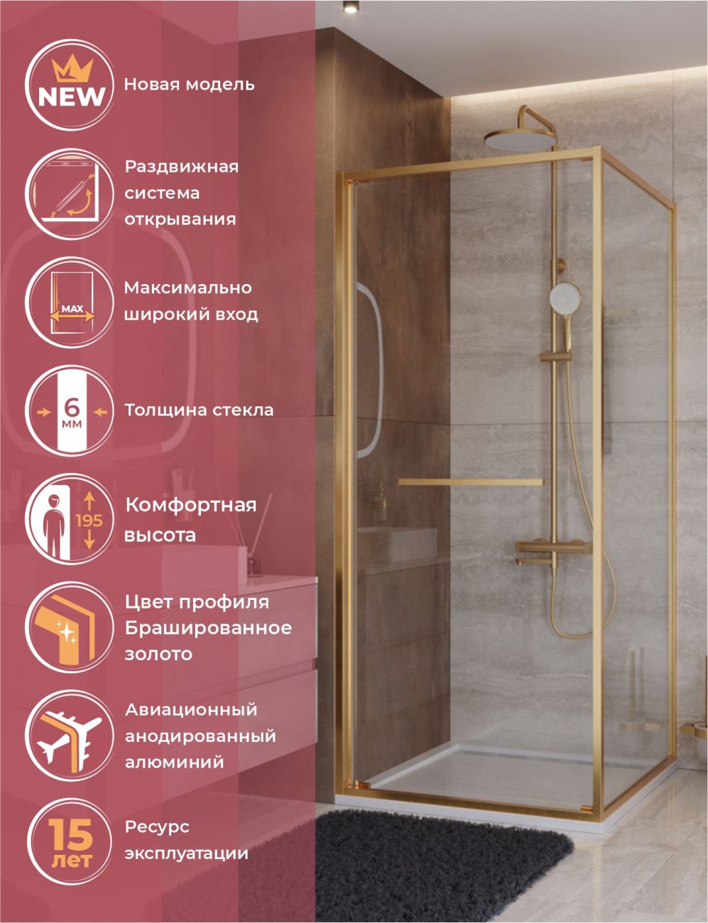 Характеристики Размеры : 90×90 см. Ширина входа : 78 см. Высота : 195 см. Диа... Подробнее