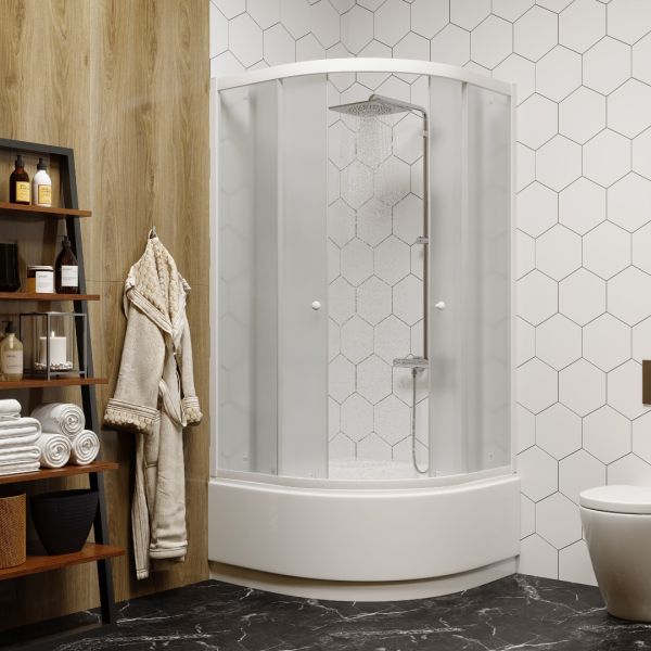 Легкосъемный экран.Достоинства:Матовое полотно скрывает человека внутри, снаружи можно рассмотреть только контуры тела.Плавный ход створок.Двери смыкаются плотно, вода наружу не просачивается.