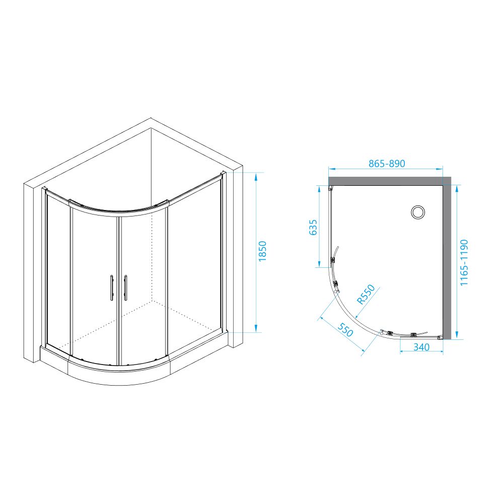 Душевой уголок ассиметричный, две раздвижные двери. Трап или поддон приобретается отдельно.