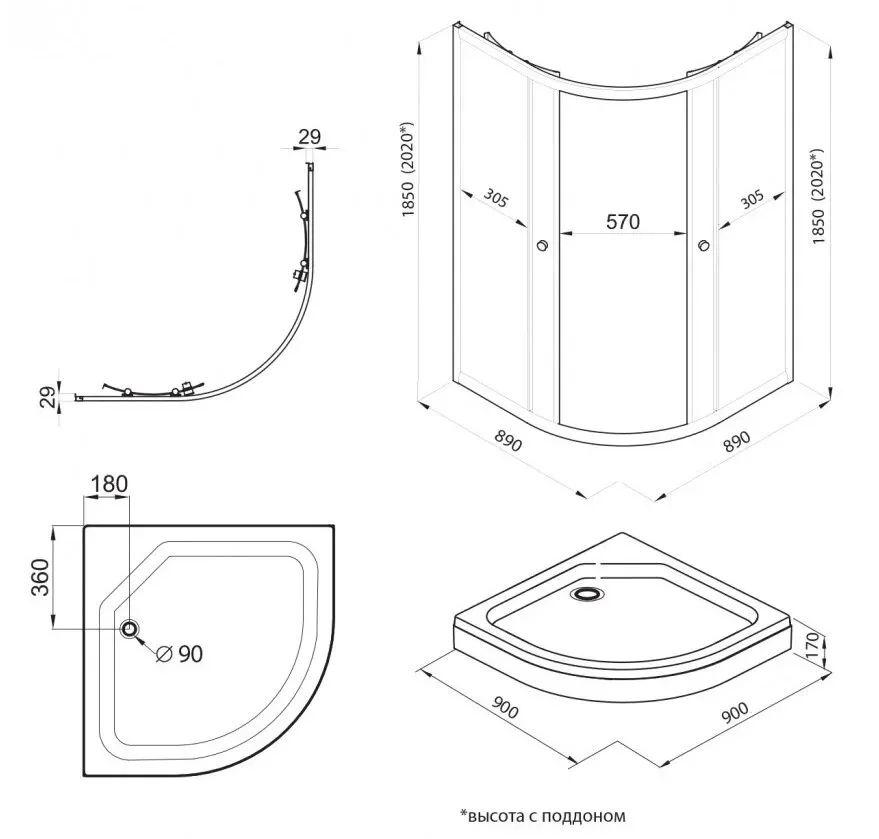 • Высота с поддоном: 202 см
