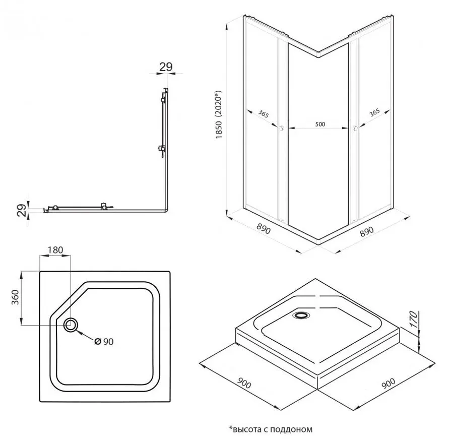 • Высота с поддоном: 202 см