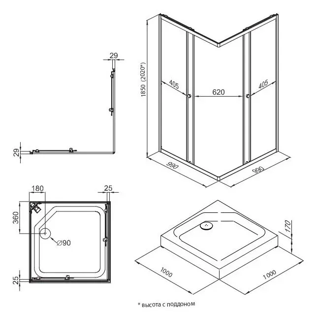 • Высота с поддоном: 202 см