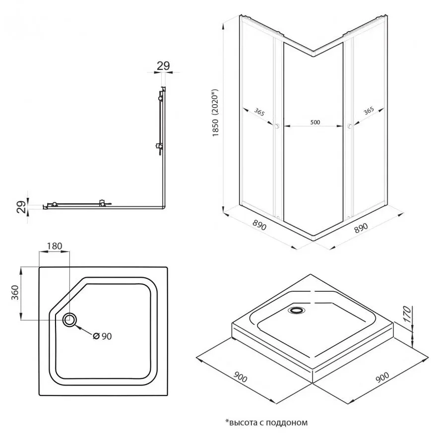 • Высота с поддоном: 202 см