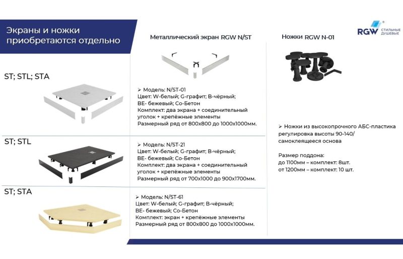 - Комплект из 10 шт. Ножки для поддона RGW N-10 Черные 03230111-31 (для поддонов длиной от 1200 мм включительно).