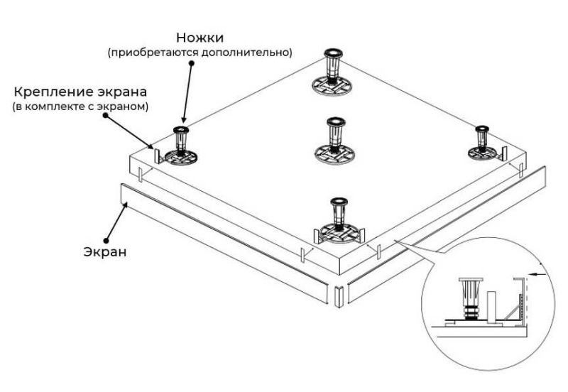 Комплектация: 2 экрана (фронтальный и боковой), соединительный уголок, крепление к ножкам на которые устанавливается поддон.