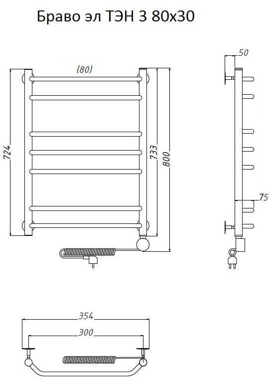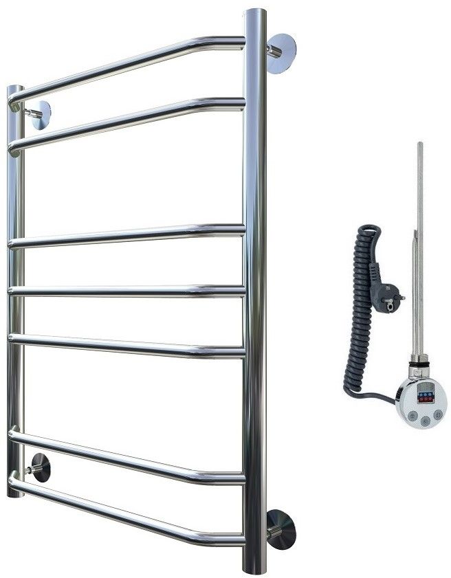 Внимание! Для скрытого монтажа электропроводки необходимо приобрести комплект скрытого подключения. Полотенцесушитель электрический комплектуется ТЭНом с терморегулятором и таймером. Изделие производится из нержавеющей стали AISI 201. Вертикальные трубы d -32 мм., для горизонтальных вставок используется труба d — 18 мм. Нагревательным элементом в полотенцесушителе является ТЭН. Полотенцесушитель заполнен бытовым антифризом.Экономичность: ТЭН нагревает антифриз до нужной температуры и выключается, далее при остывании полотенцесушителя он включается опять. Таким образом он работает не постоянно, и получается, что ТЭН потребляет электричество не 300 Вт, а порядка 100 — 150 Вт.Мощность электрического прибора порядка 100 Вт при стоимости 1 Вт — 5 руб несложно посчитать: 100Вт х 24 = 2,4 кВт в сутки. Стоимость эксплуатации изделия за сутки 2,4 кВт х 5 руб. = 12 руб. При максимальной температуре расход электричества за 30 дней составит порядка 360 руб. При условии если сушка работает круглосуточно на максимальной температуре.Удобство монтажа: Полотенцесушитель крепится к стене на четыре держателя. Изначально ТЭН не установлен в полотенцесушитель для безопасной транспортировки, его можно установить, как справа, так и слева предварительно перевернув полотенцесушитель вверх ногами и выкрутив заглушку с нужной стороны на место в которое установится ТЭН.Примечание. Внимательно изучите инструкцию по установке ТЭНа!Скрытое подключение: Для скрытого монтажа электропроводки необходимо приобрести комплект скрытого подключения.Подключение в розетку: В комплекте с ТЭНом имеется шнур с вилкой, который будет необходим при подключении к розетке.