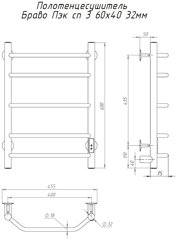 Внимание! Для скрытого монтажа электропроводки необходимо приобрести комплект скрытого подключения. Полотенцесушитель электрический комплектуется ТЭНом с терморегулятором и таймером. Изделие производится из нержавеющей стали AISI 201. Вертикальные трубы d -32 мм., для горизонтальных вставок используется труба d — 18 мм. Нагревательным элементом в полотенцесушителе является ТЭН. Полотенцесушитель заполнен бытовым антифризом.Экономичность: ТЭН нагревает антифриз до нужной температуры и выключается, далее при остывании полотенцесушителя он включается опять. Таким образом он работает не постоянно, и получается, что ТЭН потребляет электричество не 300 Вт, а порядка 100 — 150 Вт.Мощность электрического прибора порядка 100 Вт при стоимости 1 Вт — 5 руб несложно посчитать: 100Вт х 24 = 2,4 кВт в сутки. Стоимость эксплуатации изделия за сутки 2,4 кВт х 5 руб. = 12 руб. При максимальной температуре расход электричества за 30 дней составит порядка 360 руб. При условии если сушка работает круглосуточно на максимальной температуре.Удобство монтажа: Полотенцесушитель крепится к стене на четыре держателя. Изначально ТЭН не установлен в полотенцесушитель для безопасной транспортировки, его можно установить, как справа, так и слева предварительно перевернув полотенцесушитель вверх ногами и выкрутив заглушку с нужной стороны на место в которое установится ТЭН.Примечание. Внимательно изучите инструкцию по установке ТЭНа!Скрытое подключение: Для скрытого монтажа электропроводки необходимо приобрести комплект скрытого подключения.Подключение в розетку: В комплекте с ТЭНом имеется шнур с вилкой, который будет необходим при подключении к розетке.
